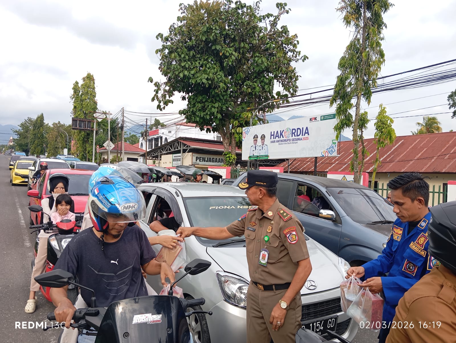 Meski arus lalu lintas cukup ramai menjelang waktu berbuka, pembagian takjil terpantau berjalan aman dan tertib.